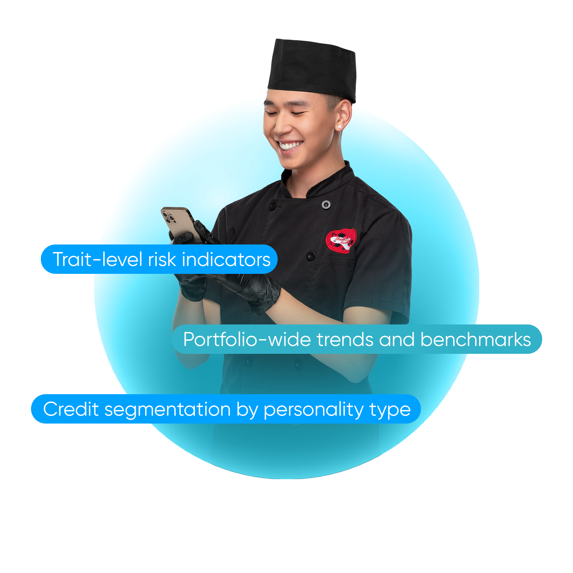 Behavioral profiles that provide deeper context for each borrower. Lenders get a window into personality traits linked to financial behavior—enabling smarter, more informed lending decisions with reduced risk and bias at greater scale, increased accuracy, and enhanced portfolio performance.
